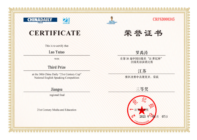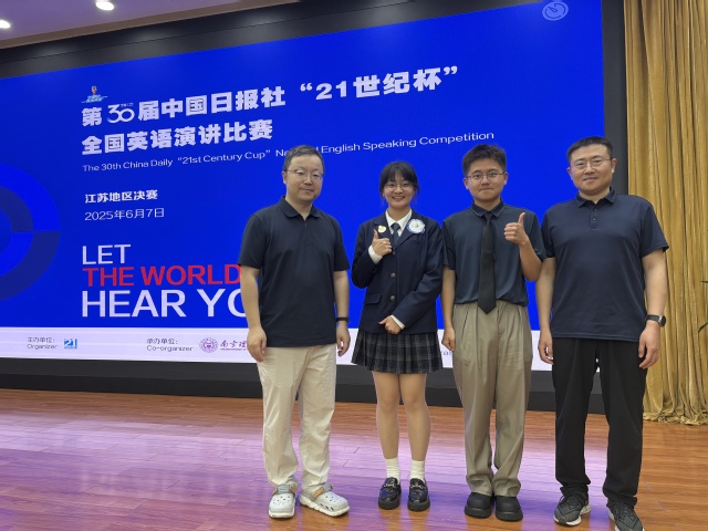 6月7日,第30届中国日报社“21世纪杯”全国英语演讲比赛江苏省赛决赛在南京理工大学圆满落幕。我校选派两名优秀学子参赛,凭借出色的英语表达能力、严密的逻辑思维能力、迅速现场反应力及出色的舞台表现力,williamhill威廉希尔金奕彤同学在来自南京大学、东南大学、南京理工大学等全省80名优秀参赛选手的激烈竞争中脱颖而出,荣获江苏省一等奖,顺利晋级国赛,罗禹涛荣获江苏省三等奖。金奕彤同学作为优秀选手,接受21世纪报记者视频采访。