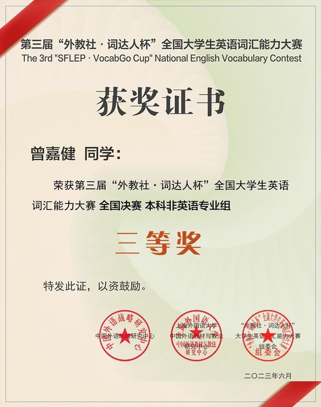 近日,第三届“外教社·词达人杯”大学生英语词汇大赛全国决赛顺利结束。经过激烈角逐,我校19级软嵌2班曾嘉健同学获全国决赛三等奖,我校获得优秀组织奖。