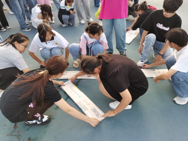 本次心理团辅由“硬币组合”、“铁砂掌和一阳指”、“珠行万里”、“无敌风火轮”四个活动组成。在心理站和班级助理的带领下,四项活动有序开展。其中,轻松有趣的“硬币组合”极大地调动了同学们的参与热情,整个操场充满了欢声笑语。在“铁砂掌和一阳指”中,同学们锻炼了反应速度和协调性,同时享受到了团队互动的乐趣。 “珠行万里”这一活动要求学生四人一组背对背坐下,在不用手辅助的情况下站立起来。随着人数的逐步增加,难度也不断加大,同学们需要不断地调整他们的协作方式,因为在这个任务中,团队合作、沟通能力是成功的关键。最后一个活动是“无敌风火轮”,这个活动要求参与者以班级为单位,在规定的路程内移动一个特制的履带式装置,走完规定的路程后到达终点。这个活动要求同学们充分协作,共同动手制作履带,既快又稳地走出最佳路线,在最短时间内完成任务。