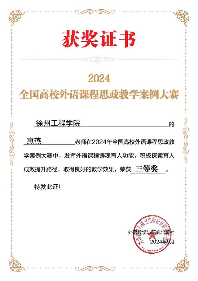 9月10日,由外语教学与研究出版社举办的2024年全国高校外语课程思政教学案例大赛获奖名单揭晓,我院教师惠燕在此次大赛中喜获三等奖。