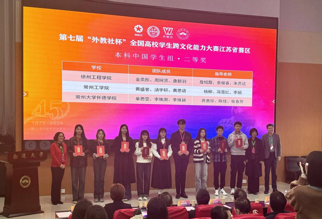 11月1日至11月3日,第七届“外教社杯”全国高校学生跨文化能力大赛江苏省赛区比赛在南通大学成功举办。由我校23英语1班金奕彤、22 汉语言师范专业周珂贤和22化妆品专业唐新羽三位同学组成参赛团队在跨文化案例展析、即兴问答和跨文化名言名句解读三个环节的激烈比拼中获得本科组江苏省二等奖的好成绩。